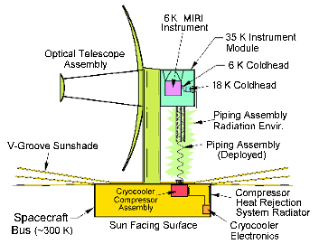 Note the opposing cylinders containing pistons. This eliminates any vibration which is very important for such a sensitive telescope. It uses helium as a refrigerant. The cryo-cooler is located 30 feet below the MIRI to keep any heat away from the CCD detectors.